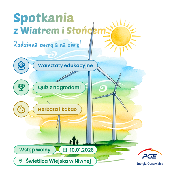 07 stycznia 2026 Aktualności Zaproszenie na warsztaty Już w sobotę, 10 stycznia, w świetlicy w Niwnej odbędą się bezpłatne, rodzinnewarsztaty edukacyjne „Spotkania z Wiatrem i Słońcem”, organizowane przez PGEEnergia Odnawialna. W programie m.in.... Czytaj więcej
