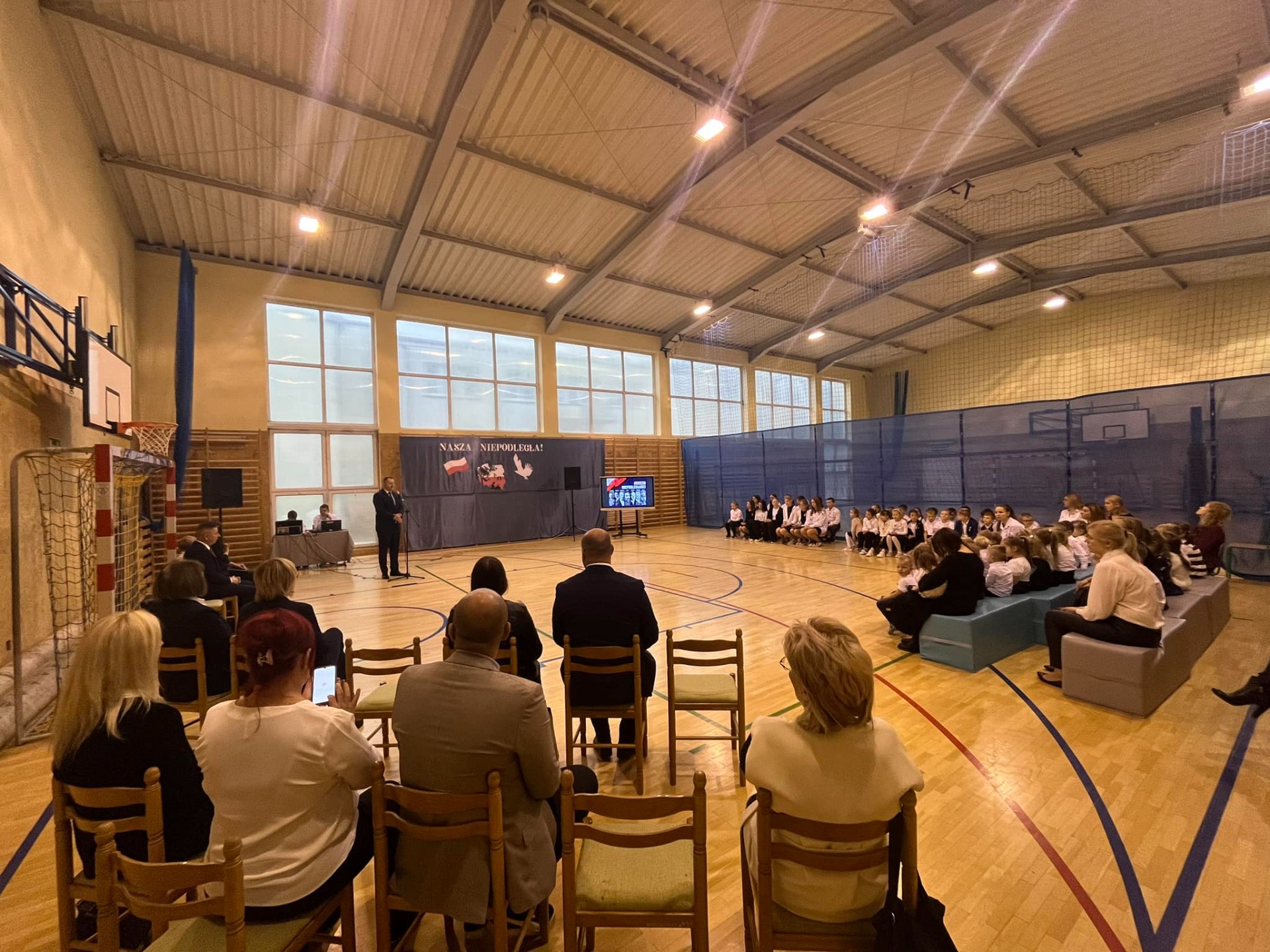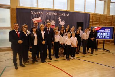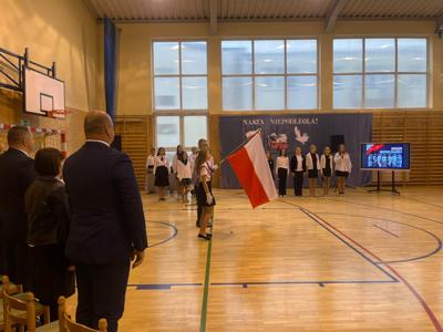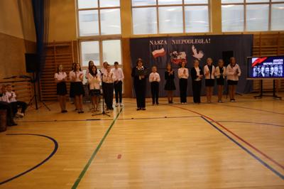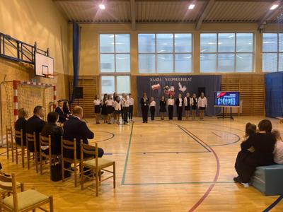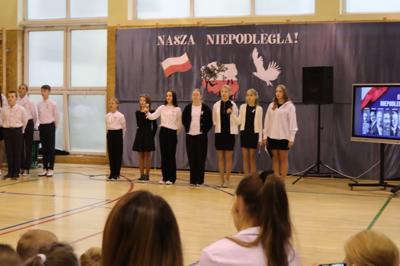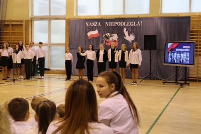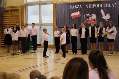 W piątek podczas uroczystej akademii uczciliśmy 106. rocznicę odzyskania przez Polskę niepodległości. To ważna data w sercu każdego Polaka, o czym przypomnieli nam uczniowie śpiewem i wierszem. Nie zabrakło wspólnego odśpiewania Hymnu Państwowego oraz Roty.