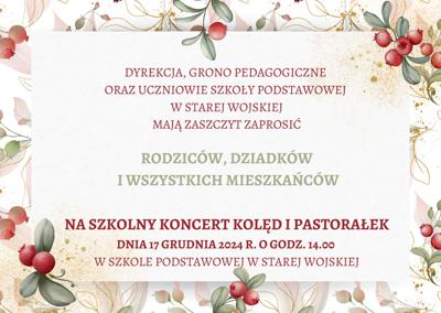 serdecznie zapraszamy na Szkolny Koncert Kolęd i Pastorałek, który odbędzie się 17 grudnia o godzinie 14.00 w naszej szkole. Zapraszamy Rodziców, Dziadków i wszystkich Mieszkańców. Bądźmy razem tego dnia, aby poczuć nastrój nadchodzących Świąt Bożego Narodzenia.