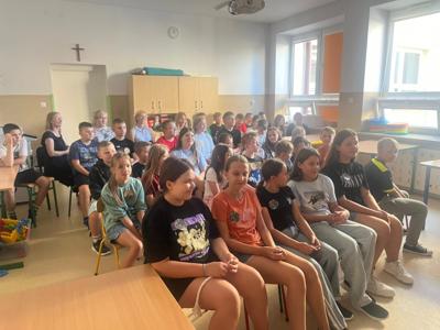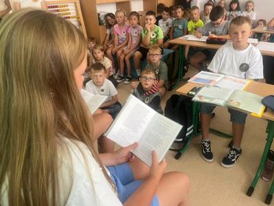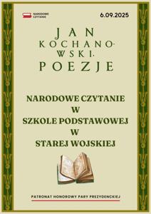 Młodsi i starsi uczniowie mieli okazję wysłuchać wybranych poezji Jana Kochanowskiego. Pani Dyrektor przybliżyła, szczególnie młodszym uczniom, postać Jana Kochanowskiego. Obejrzeliśmy także krótki film przedstawiający historię życia poety. Biblioteka szkolna udekorowała nas tematycznymi przypinkami.